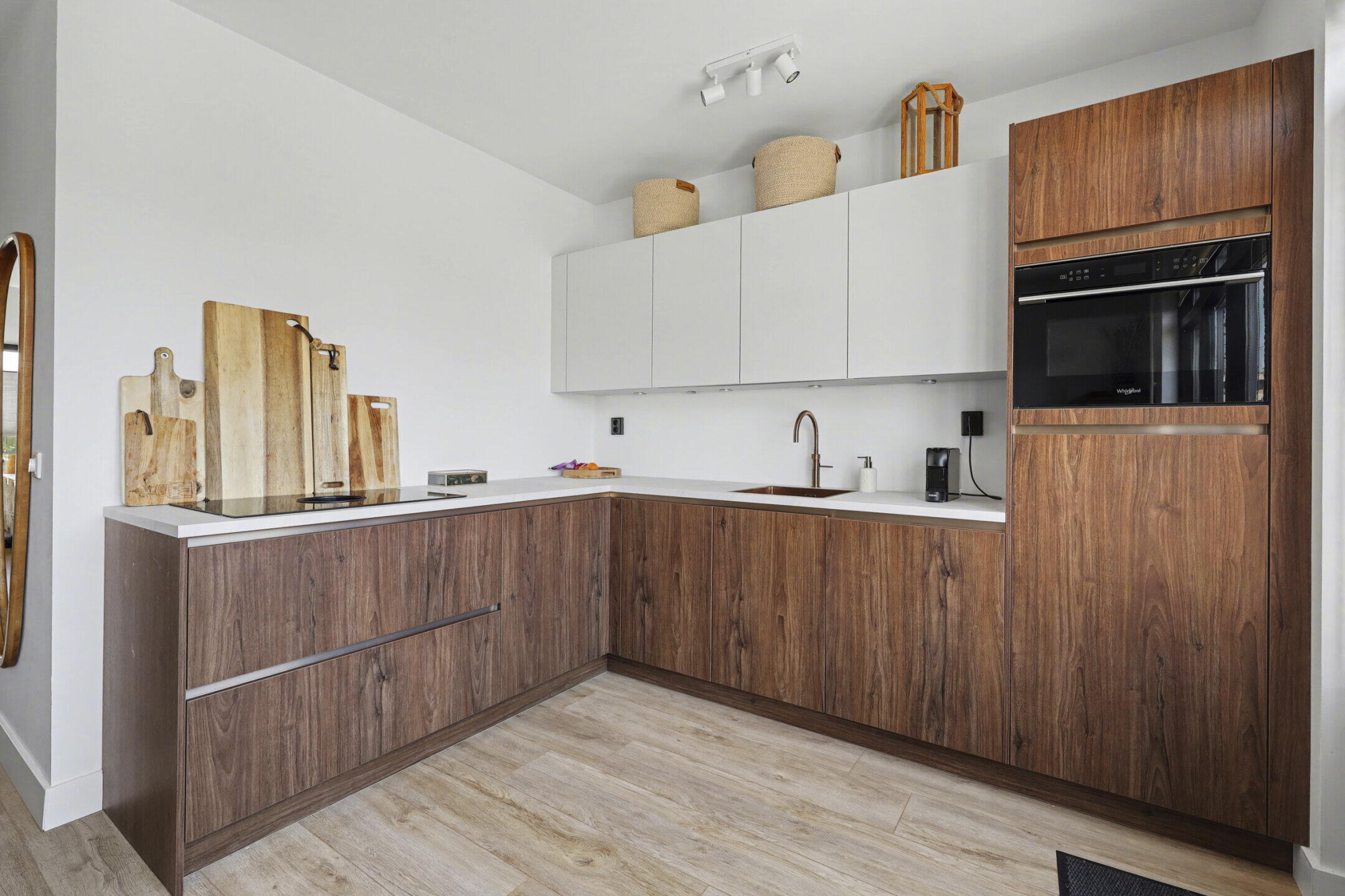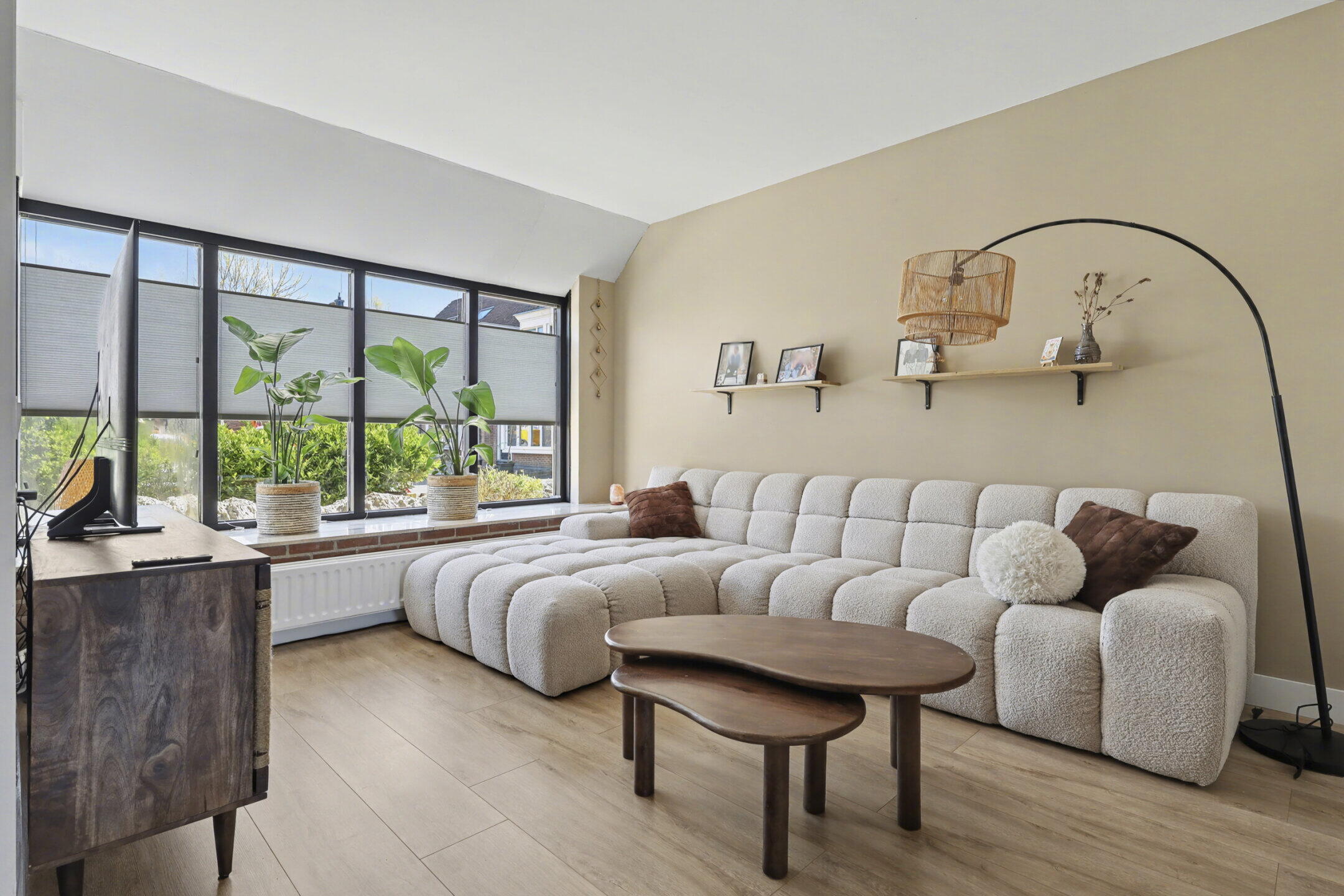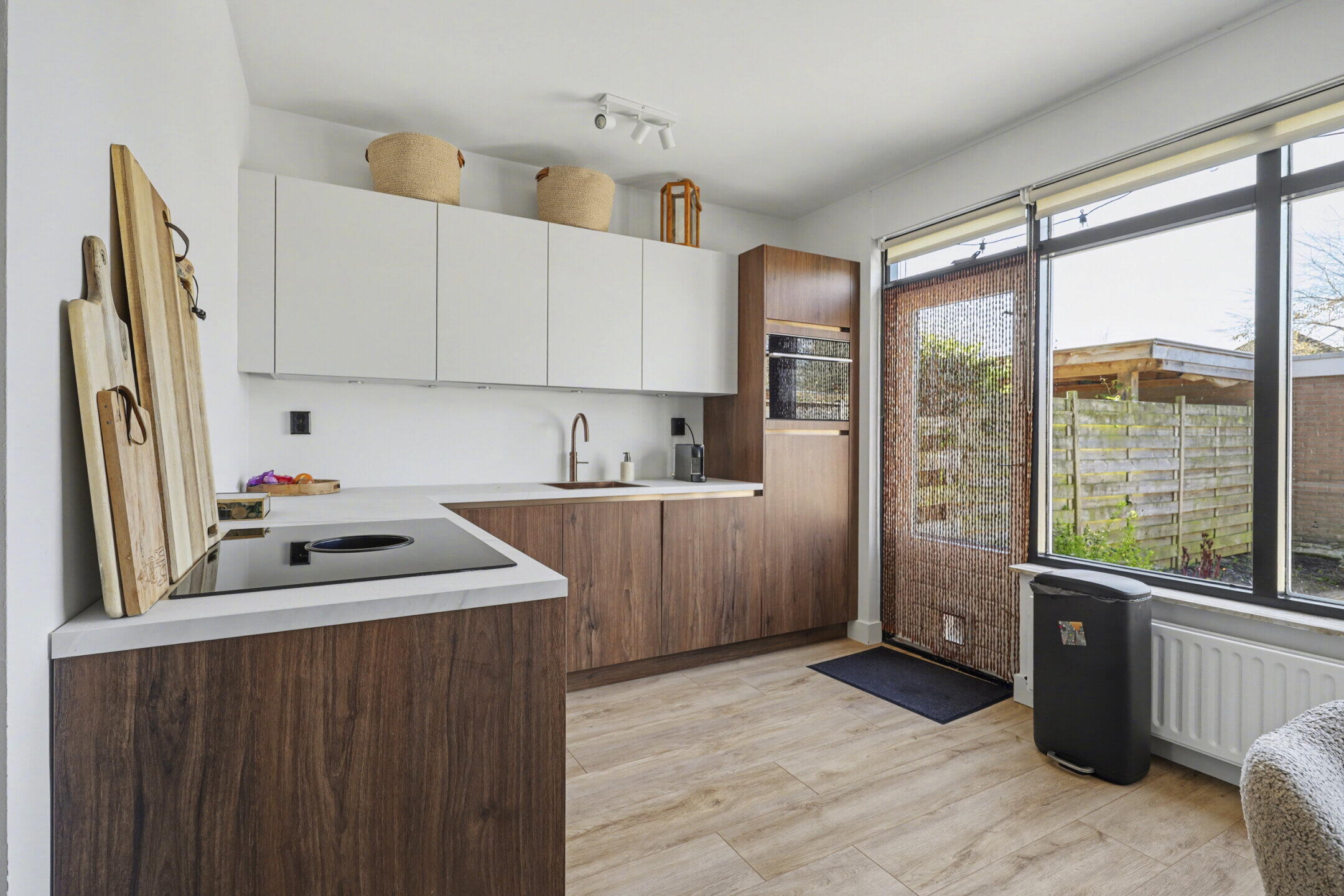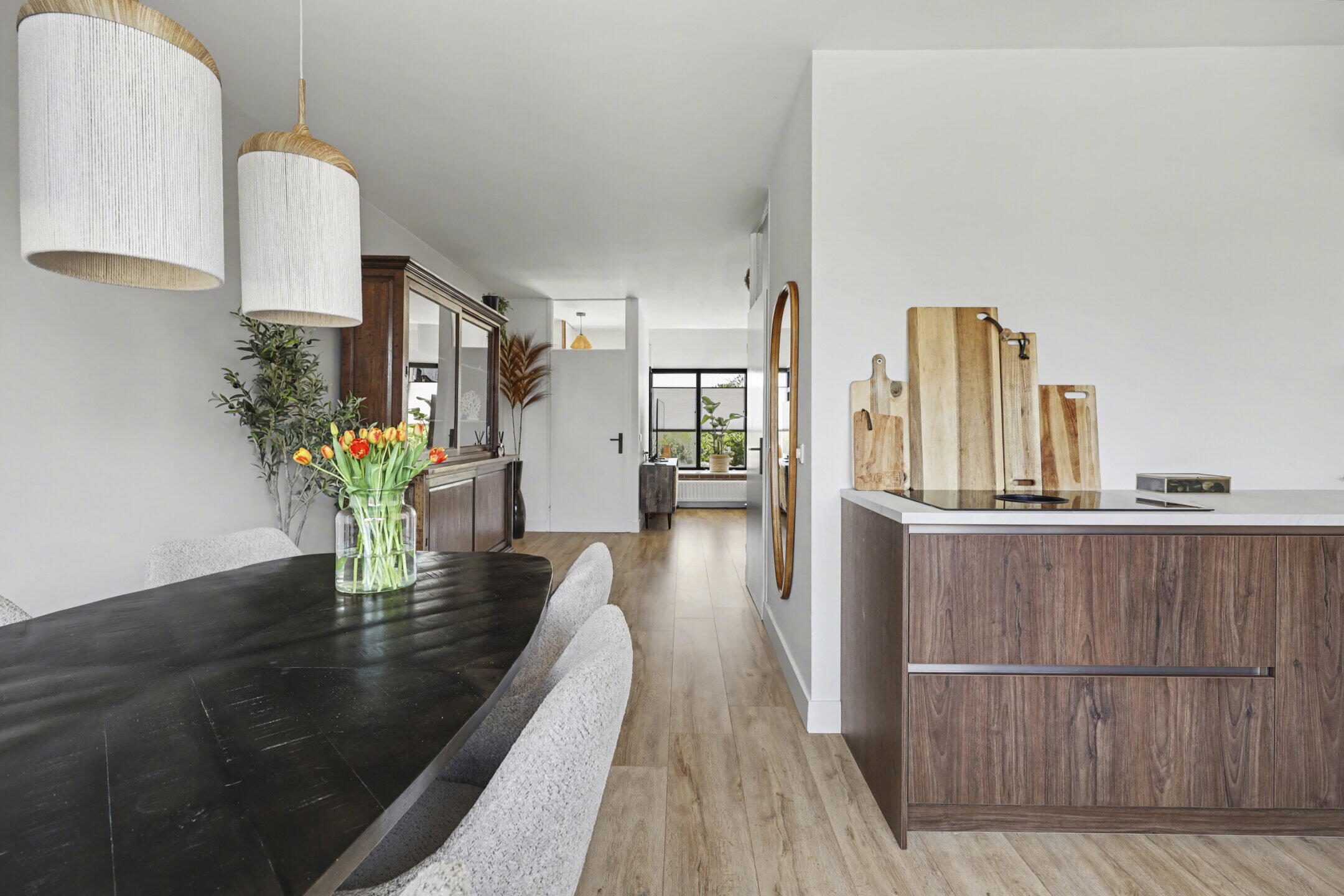 Hal met meterkast en garderobe, de Z- vormige woonkamer van ruim 30m2 met laminaat-vloer en zithoek aan de voorzijde met brede vensterbank en de ruime eethoek aan de tuinzijde met een open verbinding naar de fraaie keuken. De open keuken met tuindeur heeft een L-vormige keukenopstelling met een moderne uitstraling en voorzien van kwaliteits-apparatuur, zoals een Quooker warmwaterkraan en een Bora kookplaat met afzuiging.