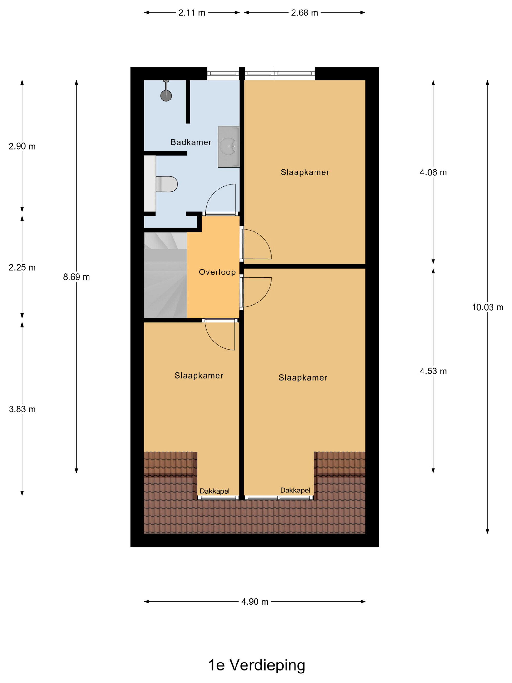 Eerste verdieping: overloop, 3 mooie slaapkamers waarvan 2 met dakkapel en een ruime moderne badkamer v.v. inloopdouche, wastafelmeubel en 2e toilet